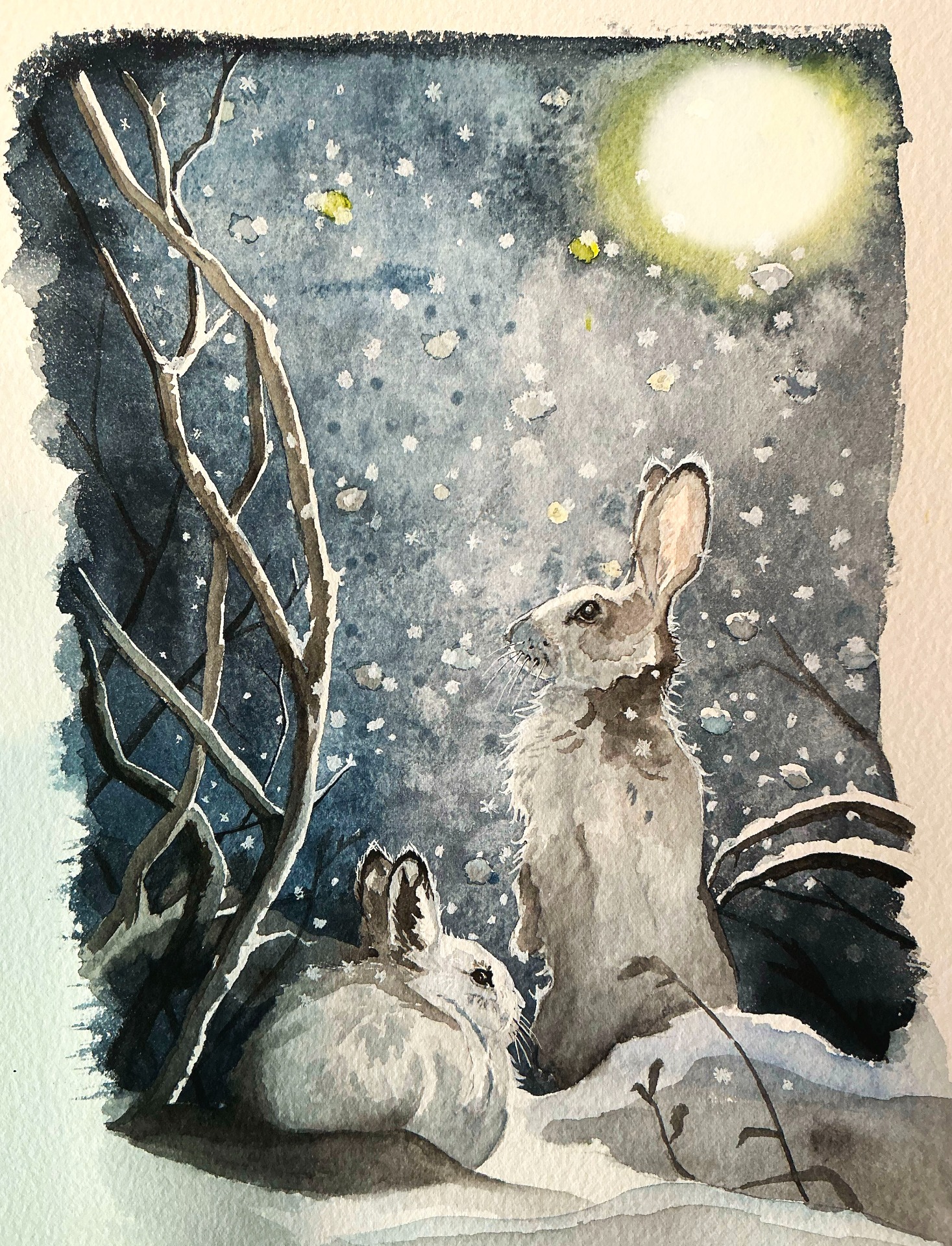 Vackert julkort av akvarellmålningen "Hare i vinterskrud".